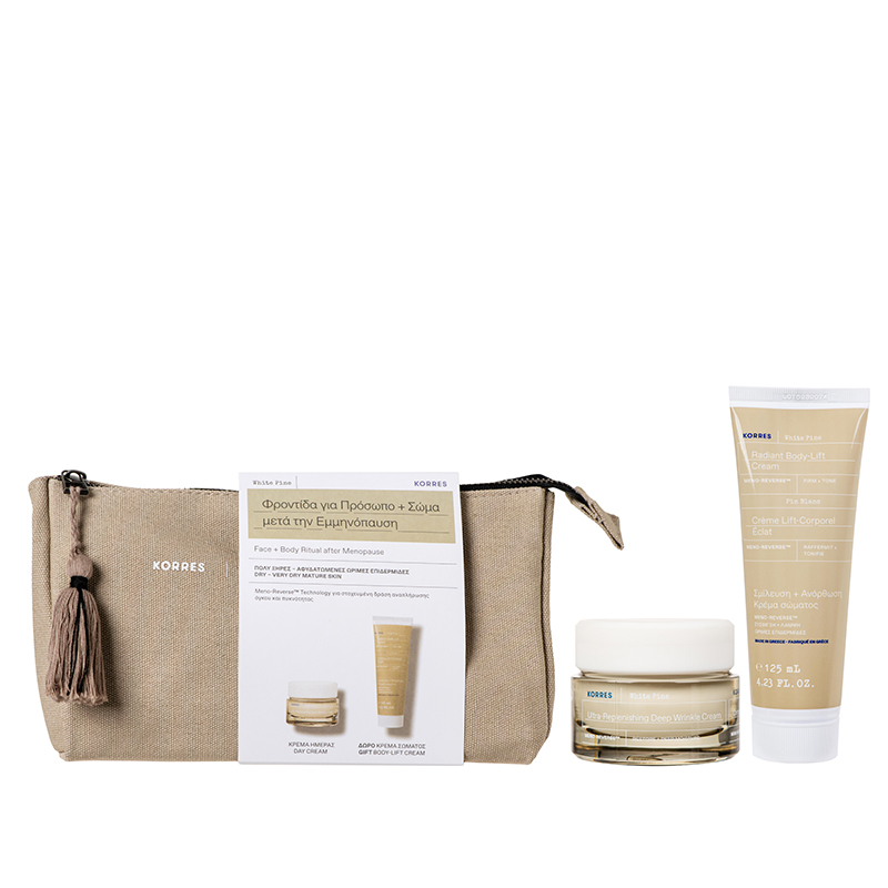 The set includes White Pine Ultra-Replenishing Deep Wrinkle Cream Meno-ReverseΤM / Restore and Deep Moisture White Pine Radiant Body - Lift Cream Meno-ReverseΤM / Firm + Tone.
